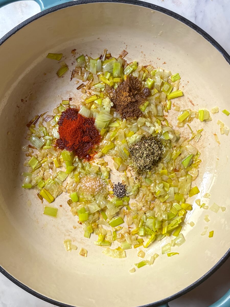- Sprinkle in cumin, paprika, oregano, salt, and pepper, and mix well.