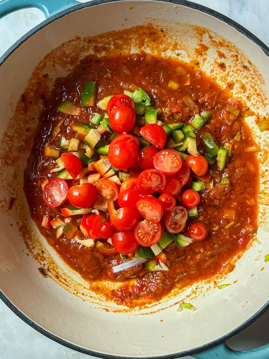 - Stir in the garlic, bell pepper, and cherry tomatoes. Add about ¼ cup water and stir. Lower the heat, cover with a lid and let it simmer for 5-10 minutes, until the sauce thickens slightly and the flavors come together. If the sauce starts to dry, add 1-2 tablespoons of water.