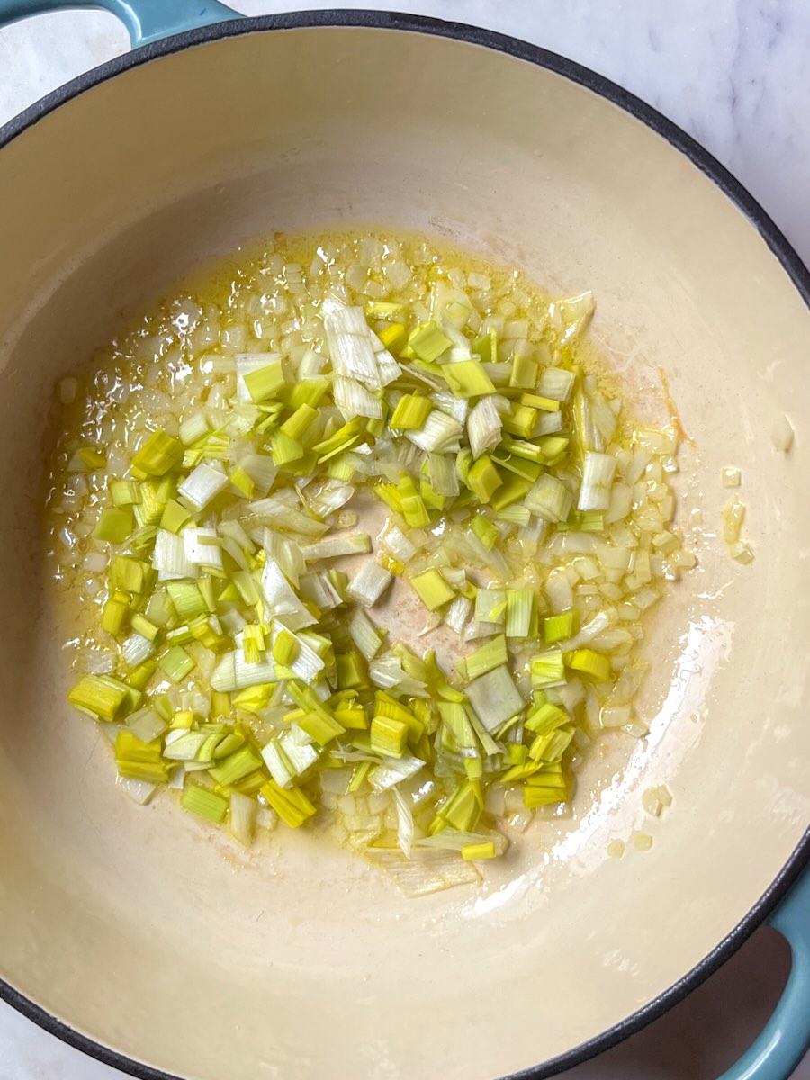 Heat olive oil in a large skillet over medium heat. Add the onion and cook for about 2 minutes until fragrant. Add the leeks and cook for another couple of minutes until they soften and turn slightly golden.