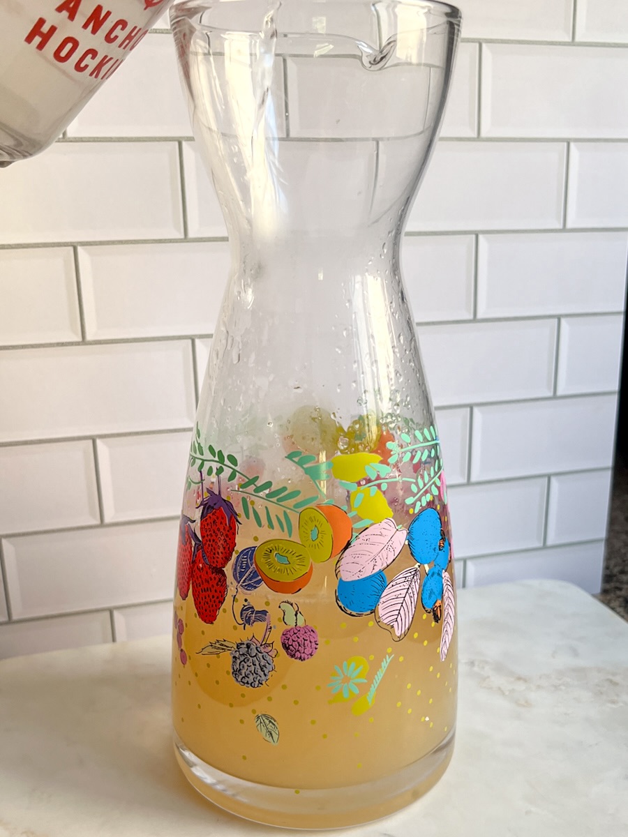 - In a pitcher, combine the ginger syrup, fresh lemon juice, and the remaining 3 cups of water.
